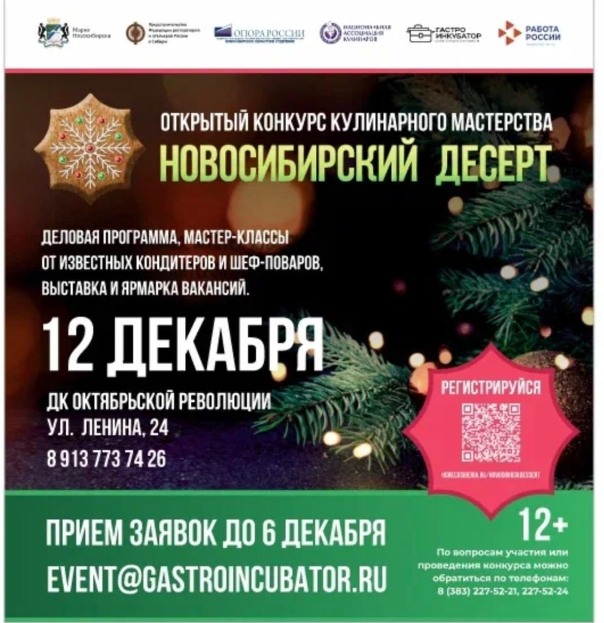 12 декабря в 10:00 в Доме культуры им. Октябрьской революции состоится кулинарный конкурс «Новосибирский десерт». Участвовать могут предприниматели и физические лица. Заявки принимаются с 1 ноября до 6 декабря.